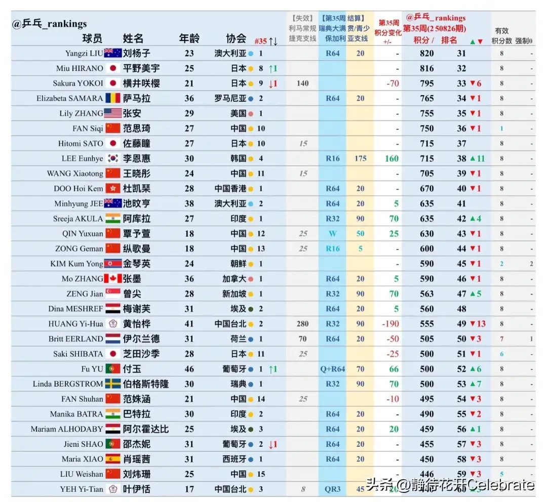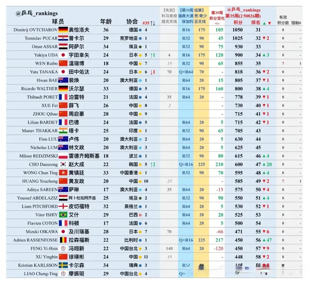 德国选手弗朗西斯卡世界排名下降4位,排在第18位。林德19,陈垣宇排在20。