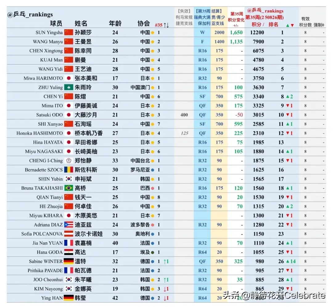 结束本站比赛世界排名也发生了一些变化,世界前10人就是中日霸榜,国乒占据六席,日本队有三人。