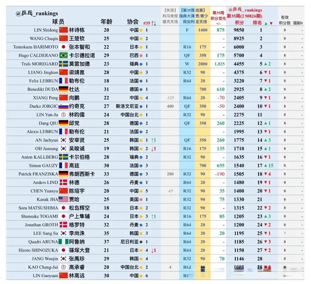 止步32强的林昀儒目前积2275分,保持第11位。打进男单8强的德国选手邱党世界排名上升一位,目前积2225分排在第12位。